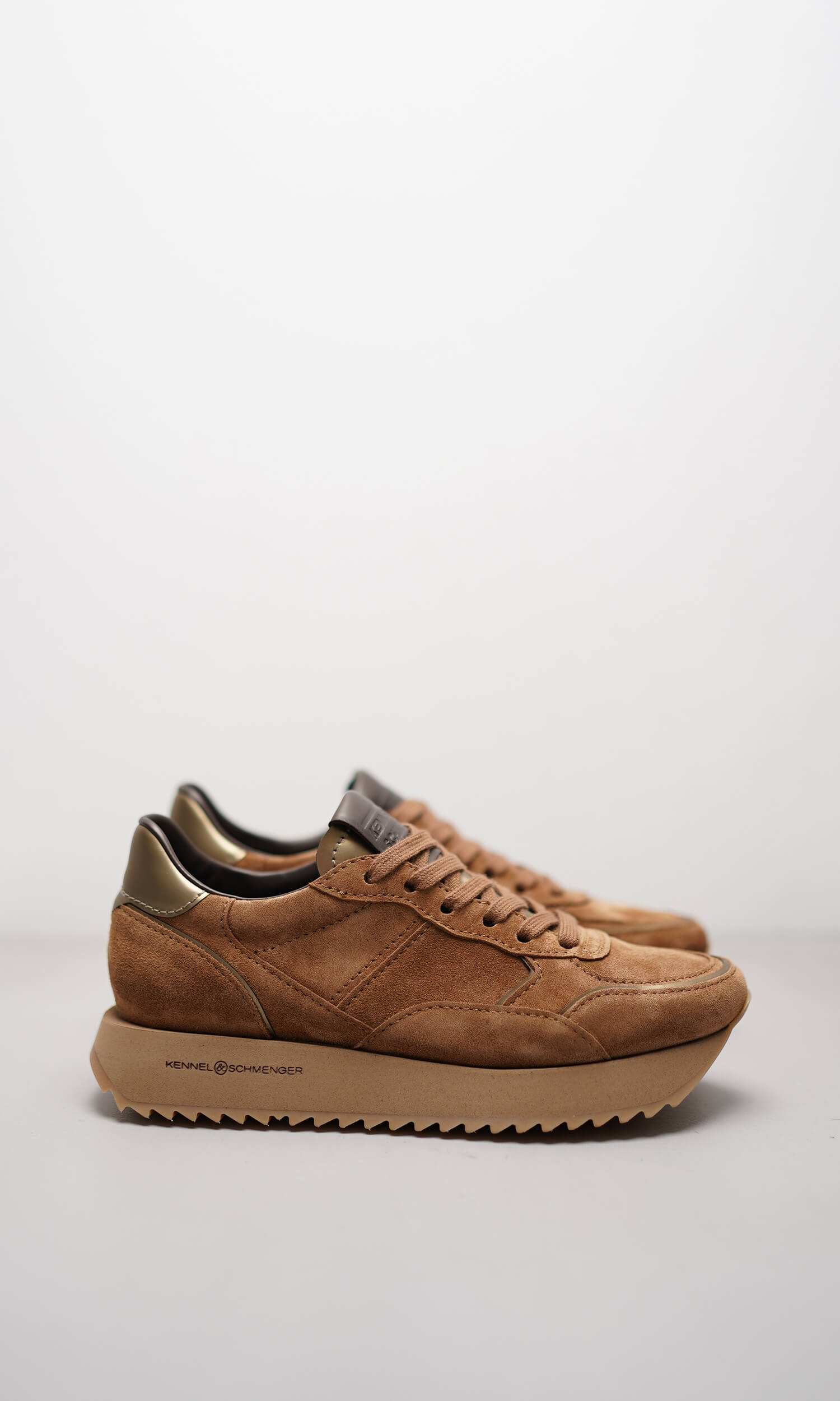Dieser Sneaker vereint sportliches Design mit edlem Finish – ein echter Allrounder für stilvolle Casual-Looks. Das weiche Veloursleder in warmem Camel-Ton trifft auf glänzende Metallic-Details an Ferse und Lasche und verleiht dem Schuh einen modernen Twist. Die markante Plateausohle mit Zackenprofil sorgt für angenehmen Tragekomfort und eine dynamische Silhouette. Ob zur Jeans, zum Rock oder als Bruch zum femininen Kleid – dieser Sneaker verleiht jedem Outfit eine coole Note und beweist, dass Komfort und Stil kein Widerspruch sind.