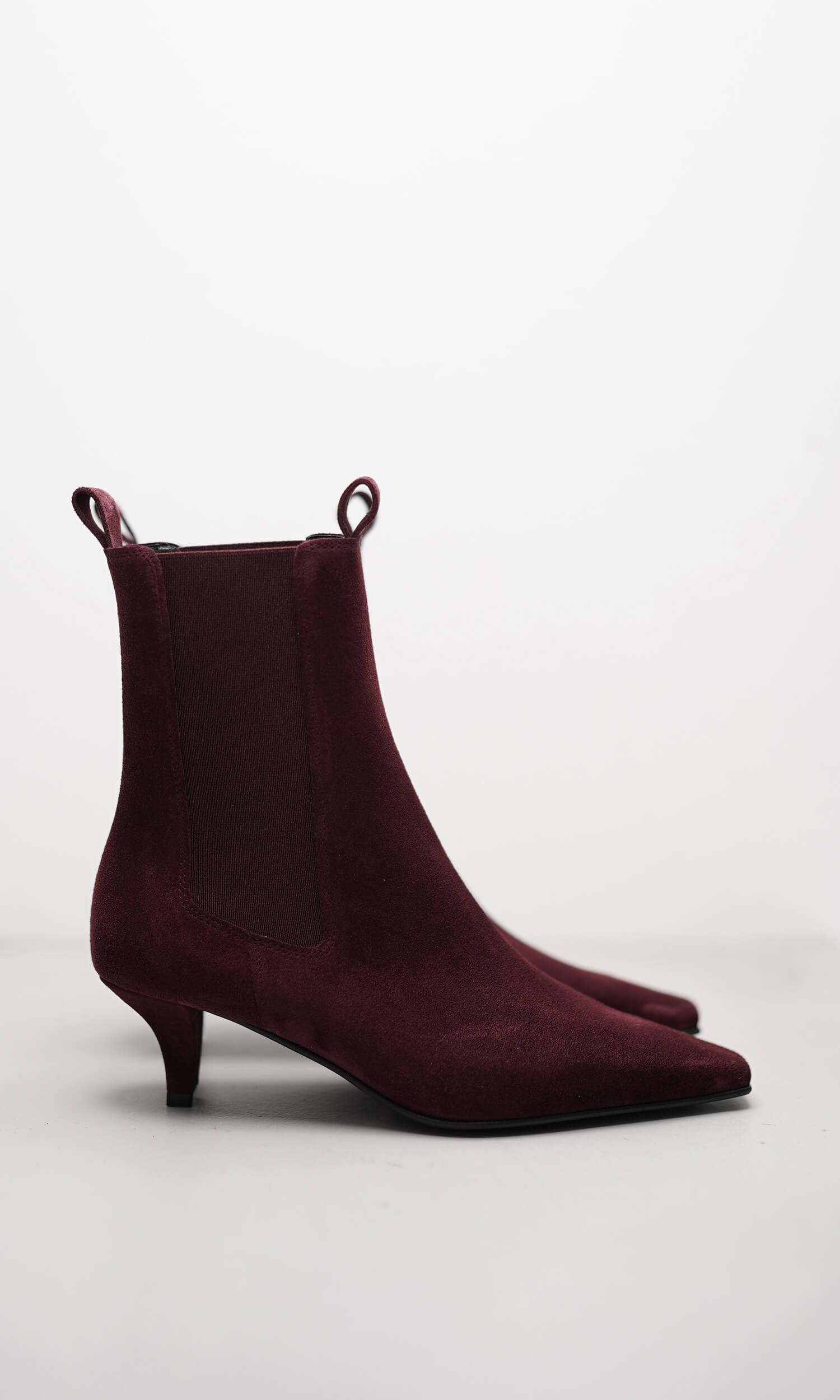 Diese moderne Stiefelette kombiniert feminine Eleganz mit dezentem Retro-Charme. Der schmale Kitten Heel und die spitze Form verleihen dem Modell eine zarte Silhouette, während das weiche Veloursleder in tiefem Bordeaux für eine warme, luxuriöse Ausstrahlung sorgt. Seitliche Stretch-Einsätze und Zugschlaufen ermöglichen bequemes An- und Ausziehen. Ein stilvoller Begleiter – perfekt für urbane Looks mit einem eleganten Twist.