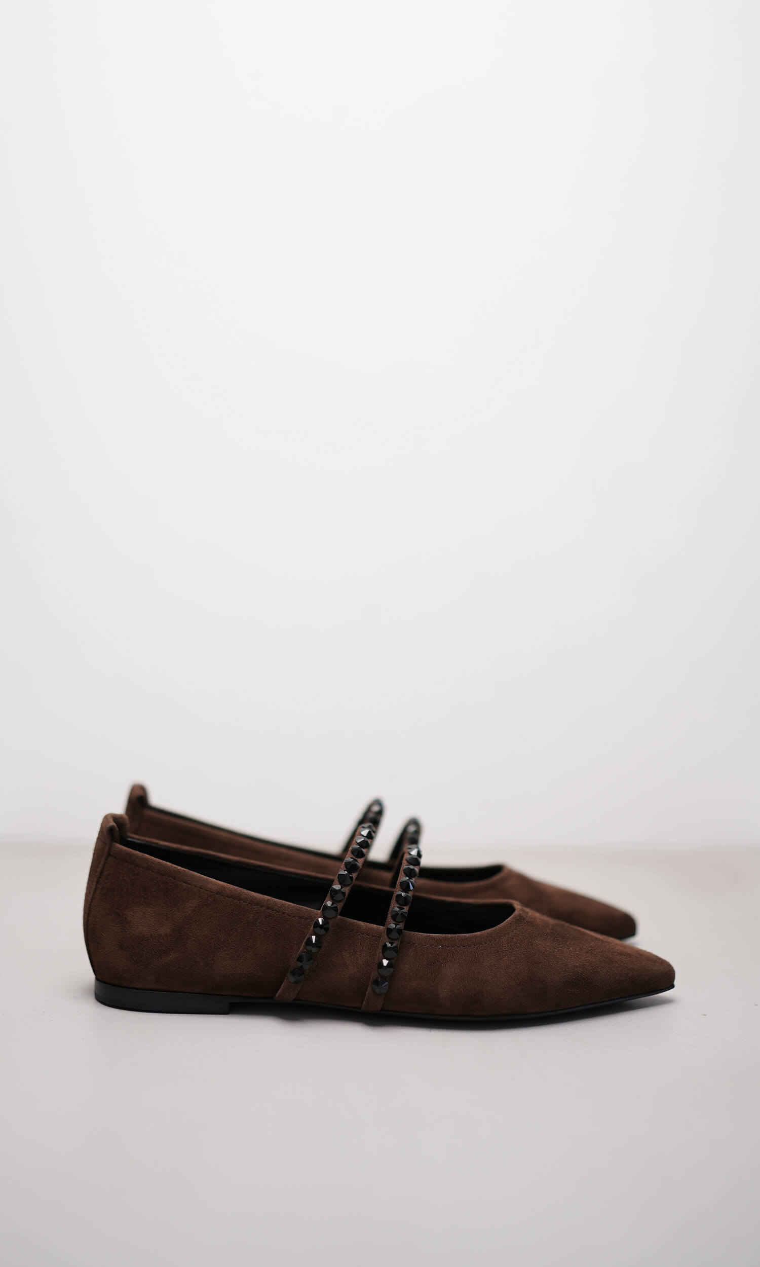 Feminin und edel so präsentiert sich unser charmantes Ballerina Modell GRETA. Das weiche Samtziegenleder in der neuen Farbe Nougat und die mit funkelnden Steinchen geschmückten Riemen machen das Modell zum eleganten Hingucker. Die spitze Silhouette sorgt für einen femininen Akzent. Das nougatfarbene Samtziegenleder sorgt für einen lässigen Touch.