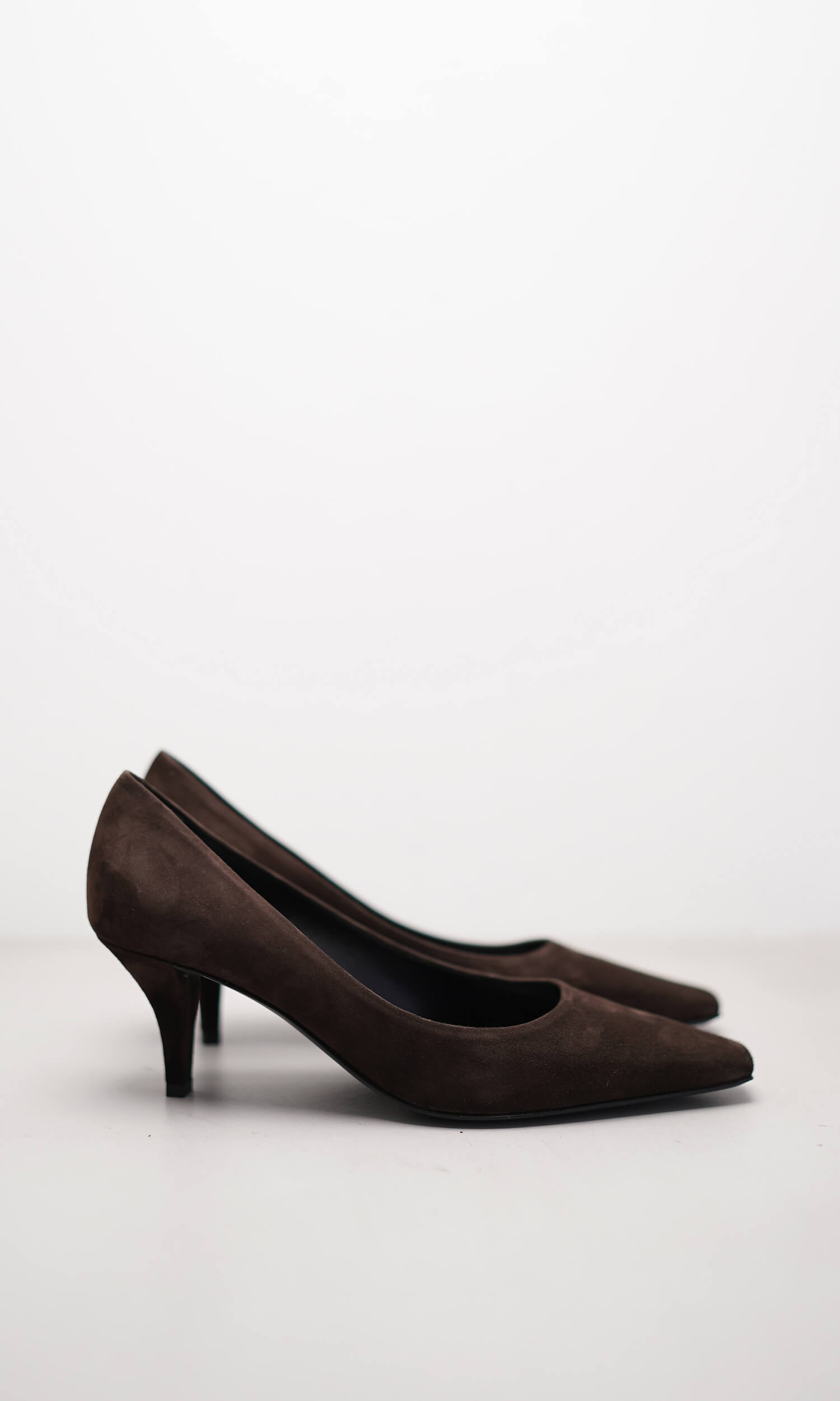 Dieser klassische Pump aus weichem Samtziegenleder in Dunkelbraun überzeugt mit seiner schlichten Eleganz und einem angenehmen, niedrigen Absatz. Die feminine Silhouette mit spitz zulaufender Vorderkappe verleiht dem Modell eine zeitlose Note, während der dezente Absatz sicheren Halt und Komfort im Alltag bietet. Vielseitig kombinierbar – ob im Büro, zu besonderen Anlässen oder als stilvolle Ergänzung zu einem Casual-Look.