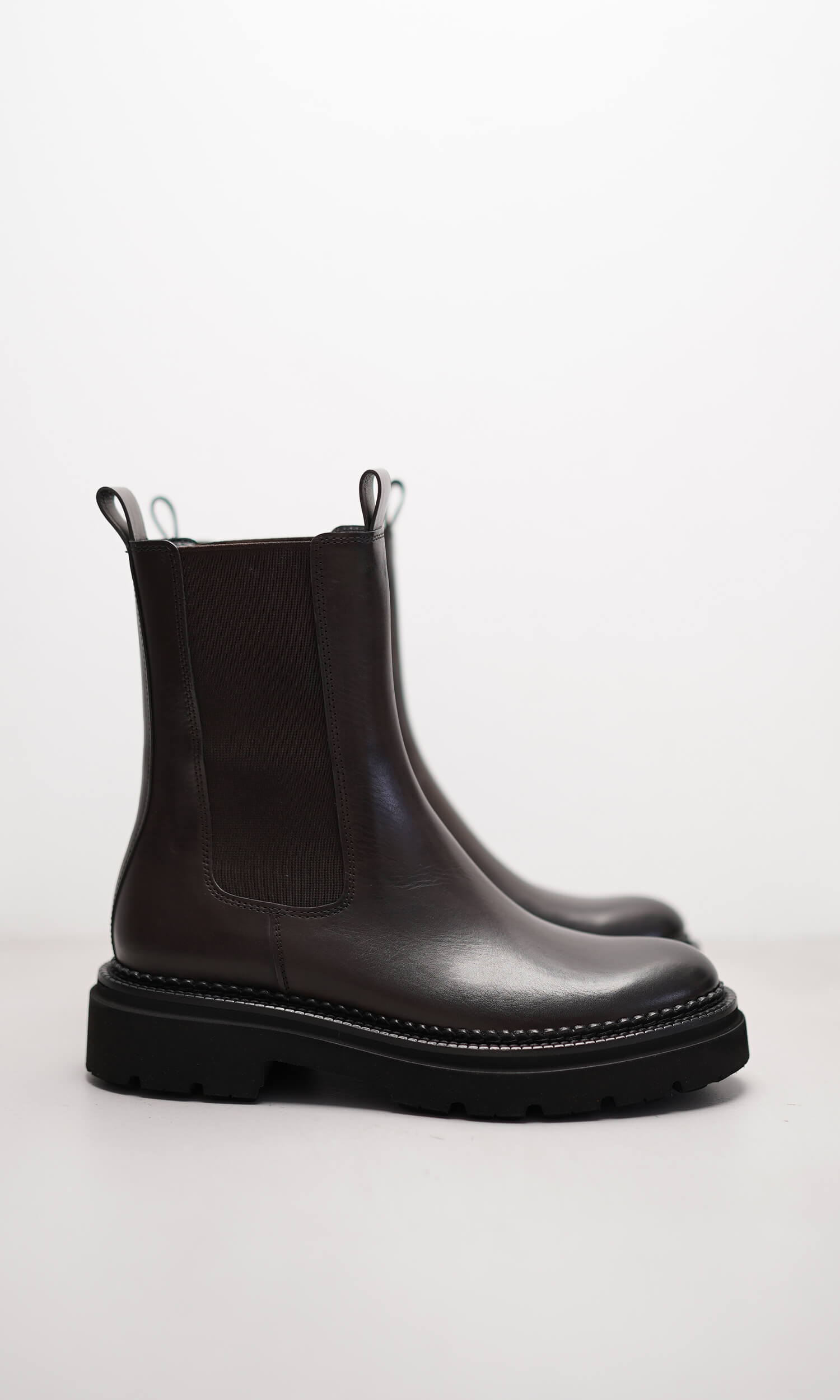 Verleihen Sie Ihrem Look eine edle und zugleich sportliche Note mit dieser exklusiven JACY Stiefelette. Das luxuriöse Kalbsleder in einem tiefen, fast schwarzen Braunton bietet eine elegante, aber zugleich warme Alternative zu klassischen schwarzen Schuhen. Die glänzende Oberfläche unterstreicht den hochwertigen Charakter des Modells, während die Stretcheinsätze an den Seiten für eine individuelle Passform und maximalen Komfort sorgen. Die extraleichte, erhöhte Gummisohle rundet das Design perfekt ab: Sie wirkt nicht nur sportlich, sondern garantiert auch den ganzen Tag über höchsten Tragekomfort. Die Sohle verleiht der Stiefelette zudem einen urbanen, dynamischen Look, der perfekt zu verschiedenen Outfits passt, von lässig bis elegant.