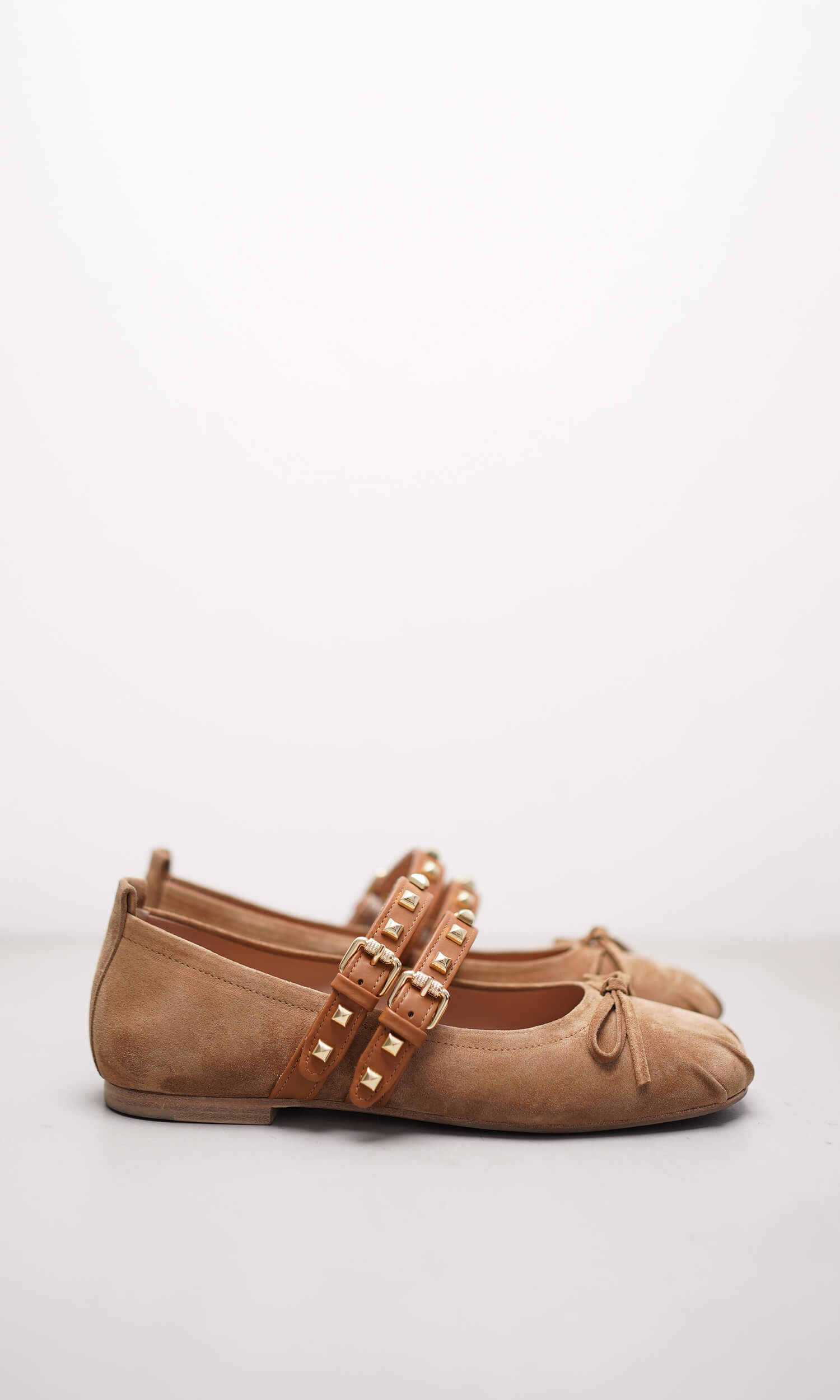 Der Ballerina LOLA vereint feminine Raffinesse mit einem Hauch Coolness. Das weiche Veloursleder in warmem Braunton sorgt für eine edle Optik, während die doppelten Riemen aus glattem Nappaleder mit goldfarbenen Nieten für ein modisches Statement sorgen. Eine zarte Schleife auf der Vorderkappe rundet das Design stilvoll ab – ein trendiger Begleiter für jeden Tag.