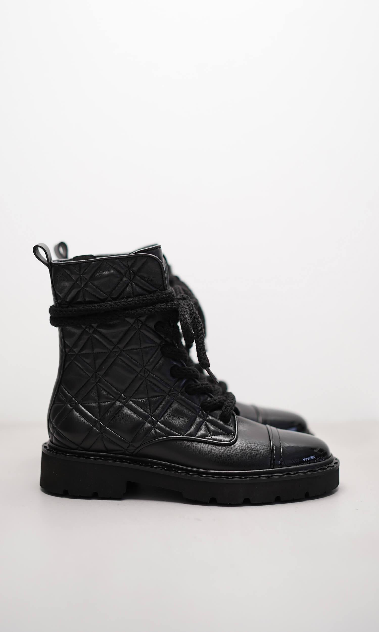 Ein Boot, der Stil und Stärke vereint: Dieser Schnürboot aus weichem, gestepptem Lackleder setzt mit seiner markanten Struktur und der robusten Profilsohle ein modisches Statement. Die abgerundete Kappe in glänzendem Finish sorgt für einen spannenden Materialkontrast und einen Hauch Eleganz. Mit den breiten Schnürsenkeln und der hochwertigen Verarbeitung wird dieser Boot zum Lieblingsstück für urbane Looks – ideal zu Cropped-Jeans, Lederleggings oder femininen Röcken und Kleidern. Ein Fashion-Update mit Charakter.