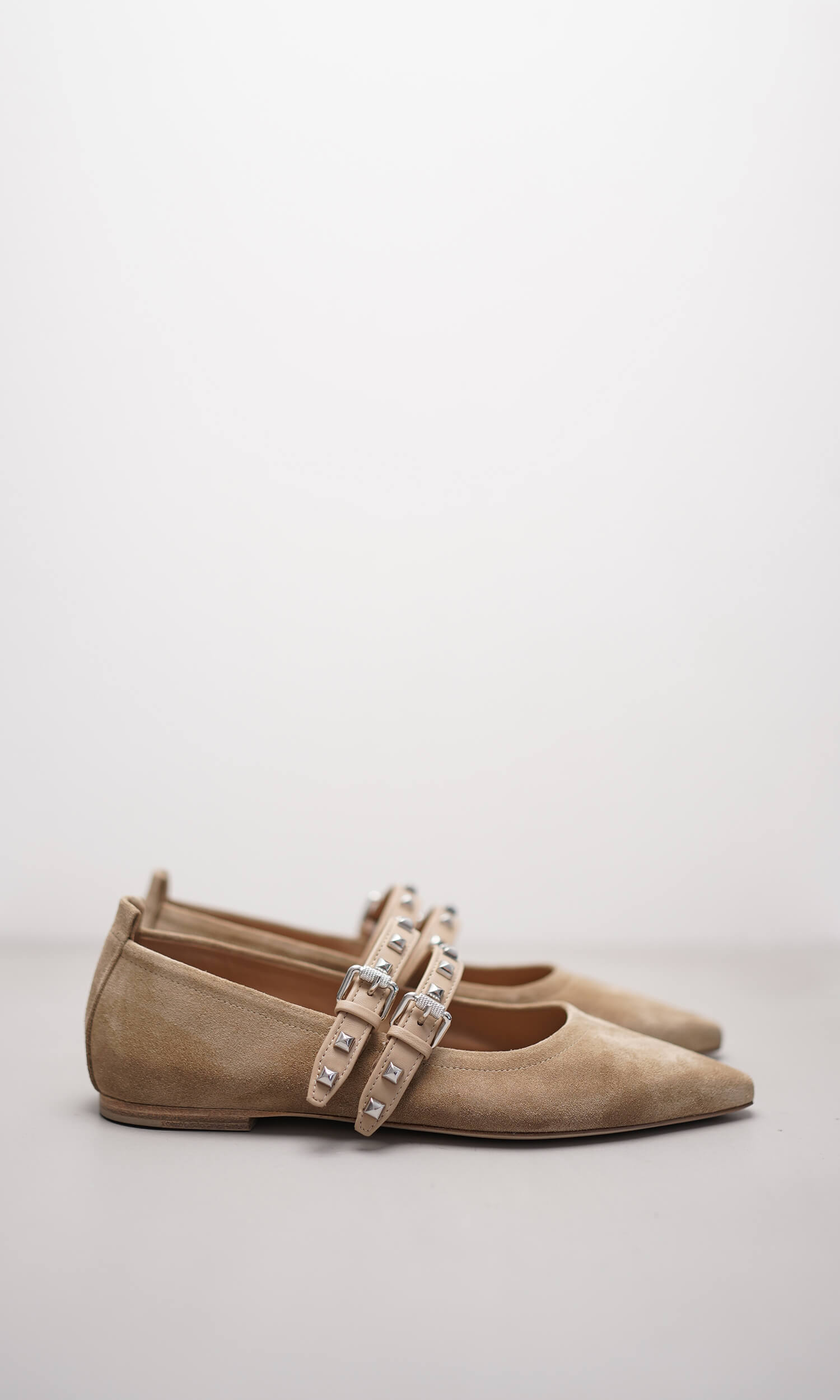 Der Ballerina NIKA vereint feminine Eleganz mit einem modernen Edge. Das Modell aus weichem Veloursleder in einem natürlichen Beigeton wird durch zwei überkreuzte Riemen aus glattem Leder mit silberfarbenen Nieten veredelt. Die spitz zulaufende Form sorgt für eine elegante Silhouette, während die flache Sohle hohen Tragekomfort bietet. Ein stilvoller Begleiter für City-Looks und besondere Anlässe.